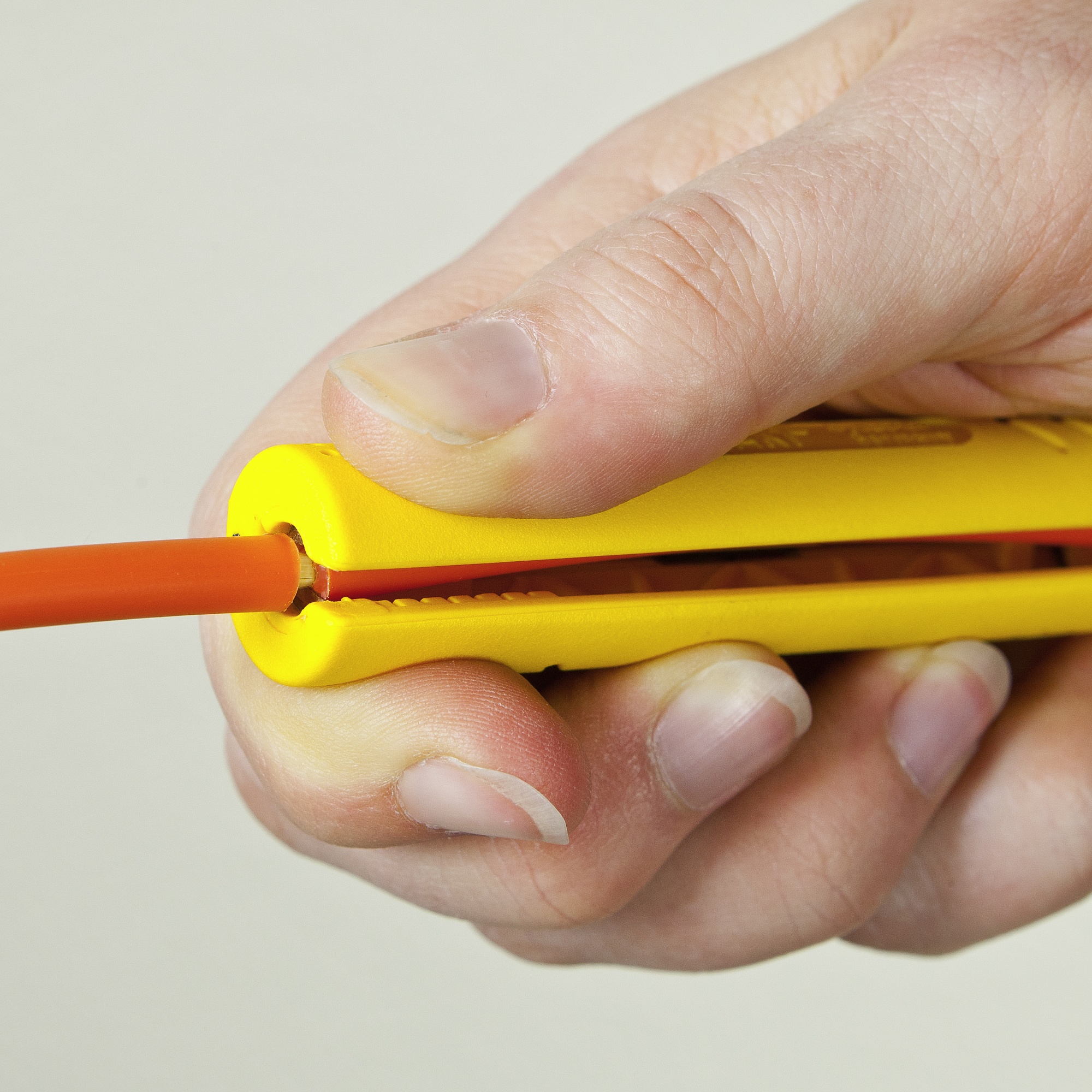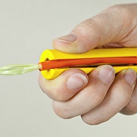 Удаление изоляции с оптоволоконных кабелей с усиленной оболочкой, например, DAC-Direct Access Cable. Шкала длины. Лезвия с покрытием TIN. Рабочий диапазон: круглые кабели до 5,9 мм Ø.
