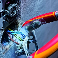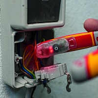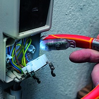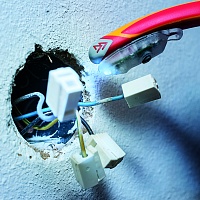 С датчиком поля для бесконтактного определения переменного напряжения с оптической индикацией (красный светодиод). Диапазон напряжения 90-1000 В, например, для кабельных соединений, розеток, колодок, предохранителей и многих других элементов.