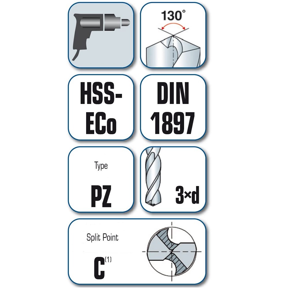 Самоцентрирующийся благодаря специальной заточке. Прочная сердцевина. Подходит в первую очередь для жёстких материалов, таких как коррозионно- и кислотостойкая хромоникелевая сталь. Благодаря короткой конструкции отлично подходит для ручных дрелей. Специальная подточка обеспечивает сверление без зернения и меткость.