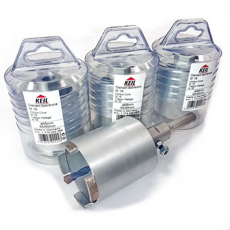 Использование алмазных коронок вместо сверл и буров позволяет производить отверстия с большей скоростью и точностью. Коронки Keil с алмазными сегментами используются предназначены для профессионального использования - для сверления отверстий в любых твёрдых материалах: камне, керамике, бетоне, кирпиче и прочих строительных конструкциях. Алмазное сверление особенно эффективно для сверления монолитных стен и при сверлении отверстий больших диаметров и на большую глубину.