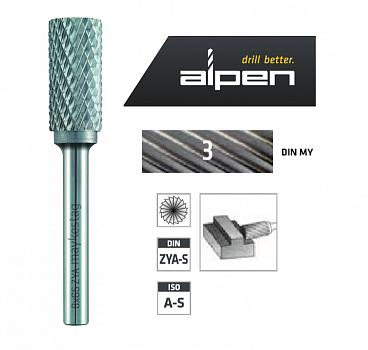 Борфреза Alpen с твердосплавными поворотными заусенцами, цилиндрические, без переднего среза, DIN-ZYA-S, ISO A-S, для общих целей, таких как удаление заусенцев, снятие фаски и сглаживание краев с чистой поверхностью. Подходит для сталей с высокой прочностью на разрыв и сварных швов.