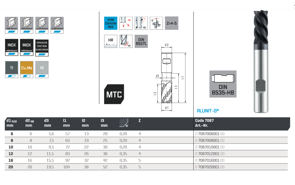MTC-SC-end mill, Z=4, Ø 6.0 45°, long, DIN 6527L, type HR, cyl. shank DIN 6535-HB, ALUNIT-S