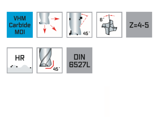 Область применения: высокопроизводительная твердосплавная фреза для черновой обработки, особенно подходит для обработки сталей от 500 до 1.400 Н / мм², нержавеющей стали, серого чугуна и титана. Высокая производительность резки при меньшей мощности привода = MTC.