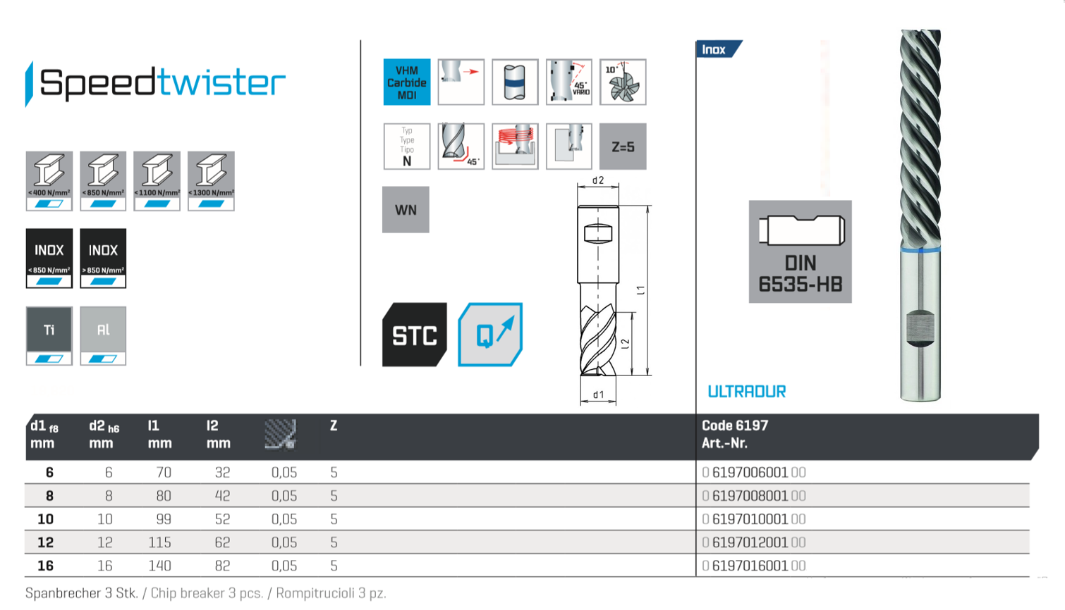 Твердосплавная концевая фреза Speedtwister-Universal, экстра длинная серия, разные углы спирали, 5xD. Для аустенитных нержавеющих сталей. Очень плавная работа и превосходный контроль стружки благодаря современной геометрии инструмента устанавливают новые стандарты в удалении стружки
