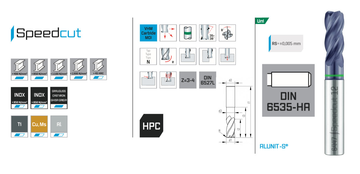 SC-SPEEDCUT Univ., Z=4, Ø 12.0 corner radius=1.5 mm, 35-38°, DIN 6527L, relieved, ALUNIT-S, cyl.shank DIN 6535-HA
