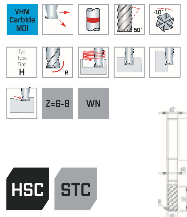 Высокопроизводительная концевая фреза , особенно подходящая для обработки закаленных и высокопрочных сталей. Высокий уровень жесткости обеспечивает хорошую скорость подачи и длительный срок службы, в то время как угол спирали создает очень хорошее качество поверхности обрабатываемой детали. Фреза используется для кругового фрезерования (чистовая обработка). Для небольших глубин также возможна резка, в этом случае скорость подачи должна быть уменьшена на 50%.