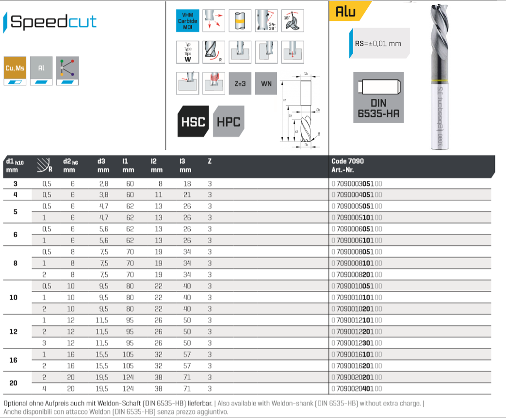 SC-SPEEDCUT Aluminium Ø 3.0, Z=3, corner radius=0.5 mm, 34-38°, extra long, relieved, cyl.shank DIN 6535-HA