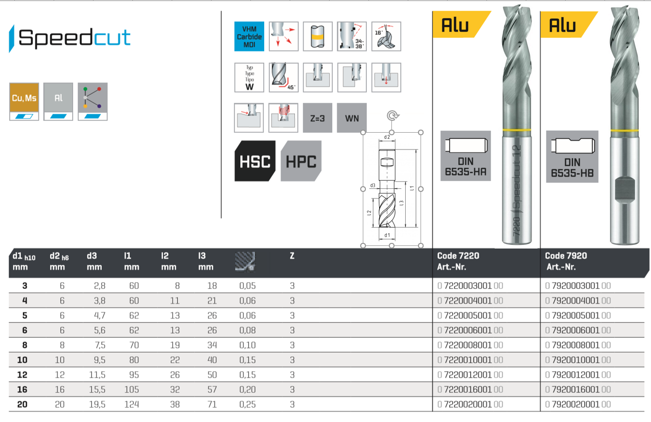 SC-SPEEDCUT Aluminium, Ø 20.0 Z=3, 34-38°, extra long,  relieved, cyl.shank DIN 6535-HA   6535-HB
