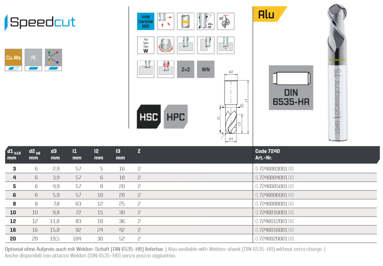 SC-Ball nose end mill SPEEDCUT Aluminium, Z=2, Ø 12.0 43-45°, DIN 6527L- relieved, cyl.shank DIN 6535-HA