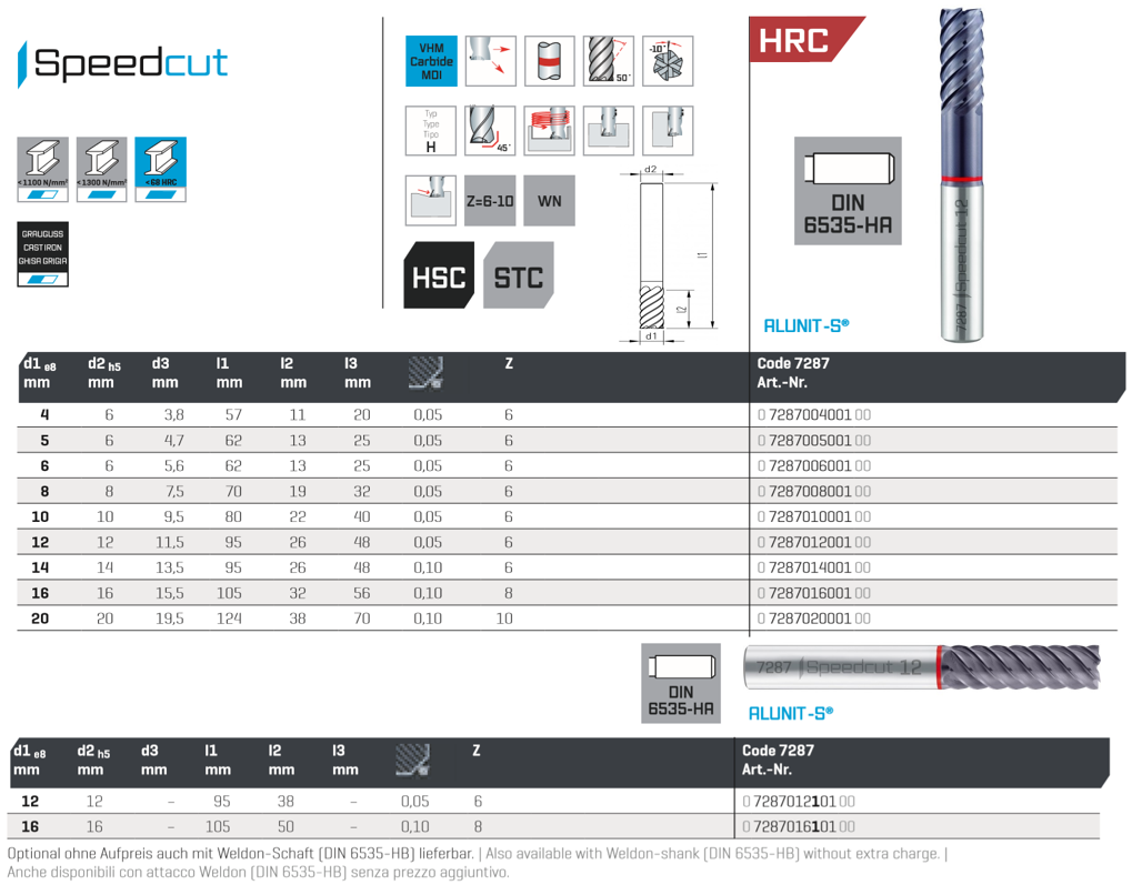 SC-SPEEDCUT Ultra Hard Steel 68 HRC, Z=6, Ø 4.0 50°, extra long, relieved, cyl.shank DIN 6535-HA, ALUNIT-S