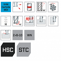 Высокопроизводительная концевая фреза , особенно подходящая для обработки закаленных и высокопрочных сталей. Высокий уровень жесткости обеспечивает хорошую скорость подачи и длительный срок службы, в то время как угол спирали создает очень хорошее качество поверхности обрабатываемой детали. Фреза используется для кругового фрезерования (чистовая обработка). Для небольших глубин также возможна резка, в этом случае скорость подачи должна быть уменьшена на 50%.