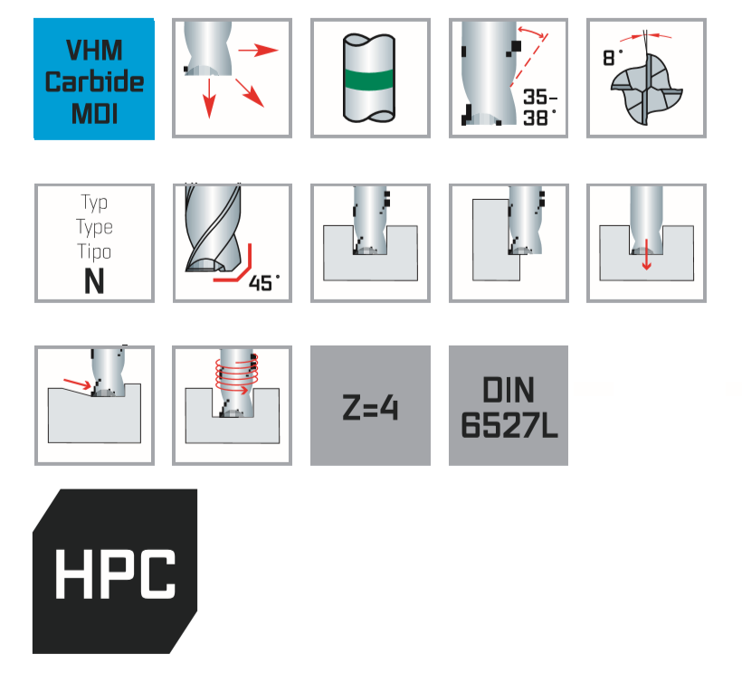 Высокопроизводительная концевая фреза для универсального применения. Чистовая, черновая и черновая обработка одним и тем же инструментом. Различные углы спирали влияют на плавность хода без вибрации и отличную поверхность. Высокая производительность резки.