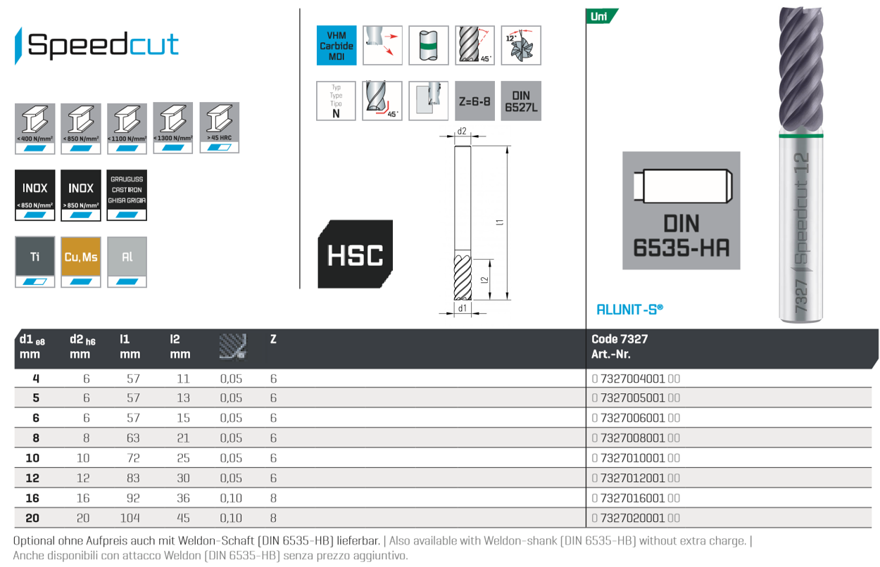 Multi flute finishing end mill SPEEDCUT Univ., Z=6, Ø 6.0 45°, DIN 6527L, ALUNIT-S, cyl.shank DIN 6535-HA