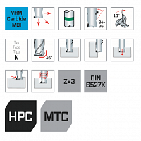 Высокопроизводительная концевая фреза с твердосплавным покрытием для универсального применения, отлично подходит для фрезерования пазов и черновых карманов. Большое пространство для стружки, агрессивный разрез и динамическое пространство для стружки для оптимизированной транспортировки стружки Различные спиральные углы влияют на плавность хода без вибрации. Благодаря меньшему энергопотреблению также подходит для приводных инструментов на токарных станках с ЧПУ (MTC).