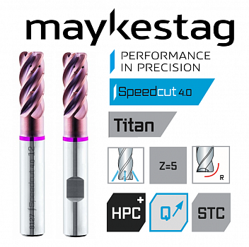 Концевая фреза с угловым радиусом HPC Speedcut 4.0-Titanium, длинная серия, горловина, пять канавок, различные спиральные углы, с внутренней подачей СОЖ.