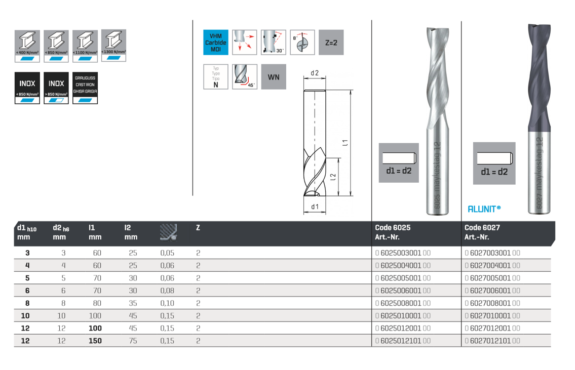 SC-End Mill, Z=2, Ø 6.0 30°, long, WS, type N, ALUNIT