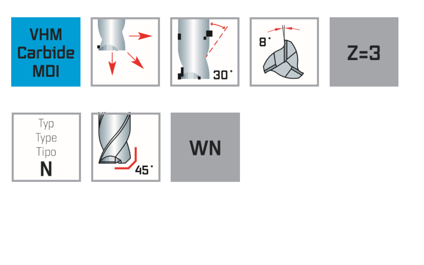Рекомендуется для фрезерования материалов со средней и высокой прочностью до 1300 Н / мм². Для сверления и последующего продольного и проходного фрезерования.
