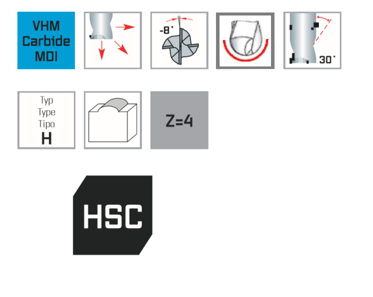Высокопроизводительная концевая фреза HSC из твердого сплава, для изготовления инструментов и форм(пресс-форм). Для высоколегированных и закаленных материалов.