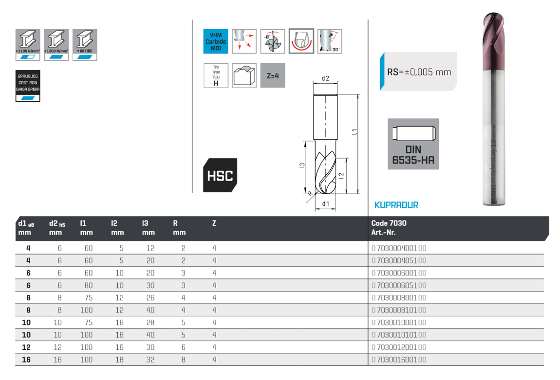 HSC Ballnose end mill Ø 6.0 80/30mm, Z=4, 30°, R=3 mm Kupradur coating, cyl. shank DIN 6535-HA