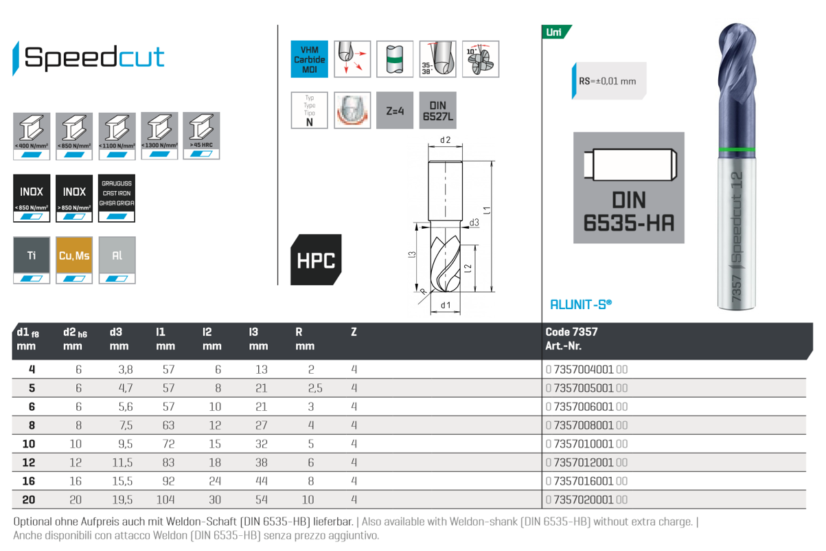 SC-Ball nose end mill SPEEDCUT Univ., Z=4, Ø 4.0 35-38°, DIN 6527L- relieved, cyl.shank DIN 6535-HA, ALUNIT-S