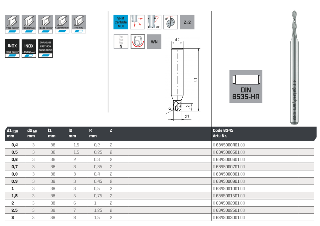 Концевая сферическая твердосплавная фреза MAYKESTAG (VHM) d 2.0 (Z=2) 30°, L-38