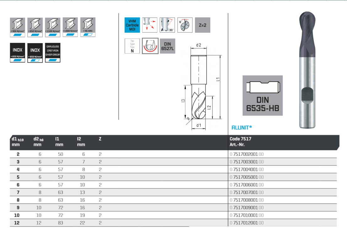 Концевая сферическая твердосплавная фреза MAYKESTAG (VHM) , d 7.0 (Z=2) 30°, L-63 ALUNIT