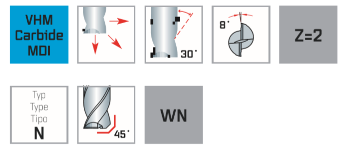 Рекомендуется для фрезерования материалов со средней и высокой прочностью до 1300 Н / мм². Для сверления и последующего продольного и проходного фрезерования.