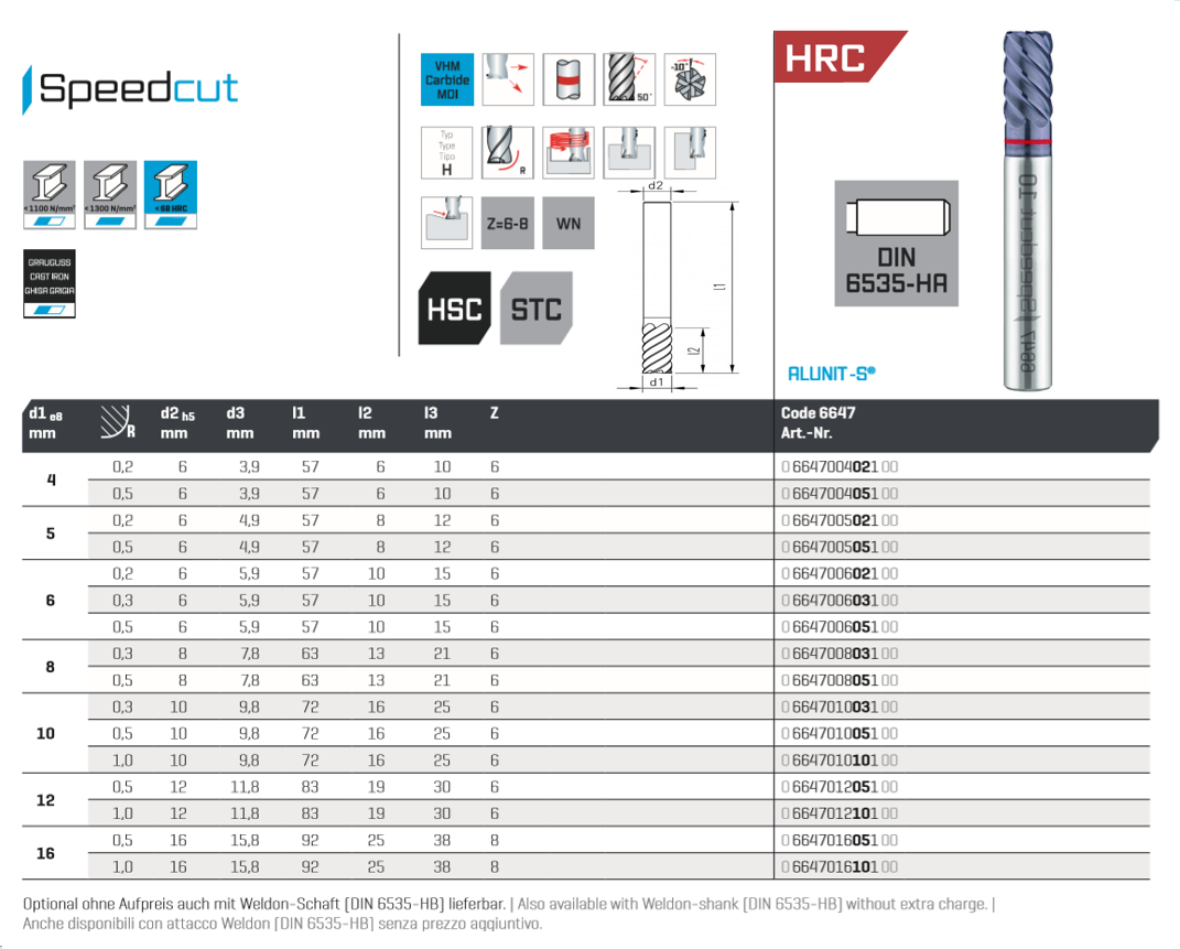 Высокопроизводительная концевая фреза , особенно подходящая для обработки закаленных и высокопрочных сталей. Высокий уровень жесткости обеспечивает хорошую скорость подачи и длительный срок службы, в то время как угол спирали создает очень хорошее качество поверхности обрабатываемой детали. Фреза используется для кругового фрезерования (чистовая обработка). Для небольших глубин также возможна резка, в этом случае скорость подачи должна быть уменьшена на 50%.