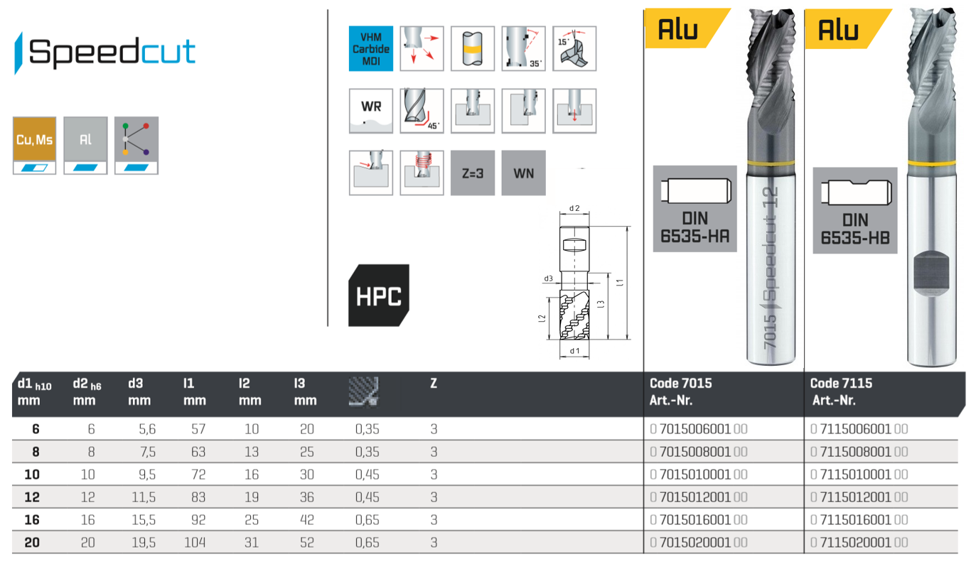 SC-roughing end mill SPEEDCUT- Aluminium, Z=3, Ø 16.0 35°, long, DIN 6527L, type WR, cyl.shank DIN 6535-HA 6535-HВ