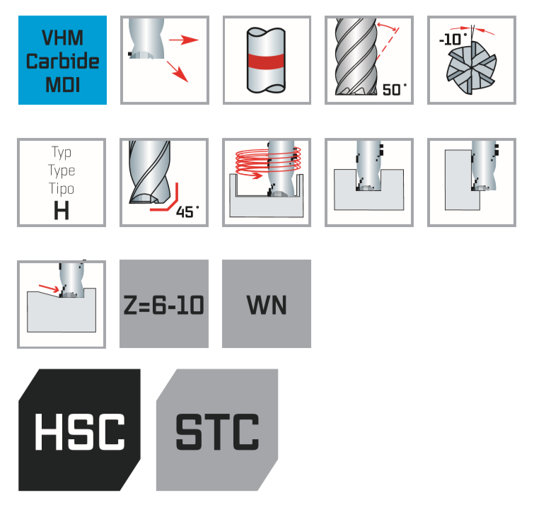 Высокопроизводительная концевая фреза , особенно подходящая для обработки закаленных и высокопрочных сталей. Высокий уровень жесткости обеспечивает хорошую скорость подачи и длительный срок службы, в то время как угол спирали создает очень хорошее качество поверхности обрабатываемой детали. Фреза используется для кругового фрезерования (чистовая обработка). Для небольших глубин также возможна резка, в этом случае скорость подачи должна быть уменьшена на 50%.