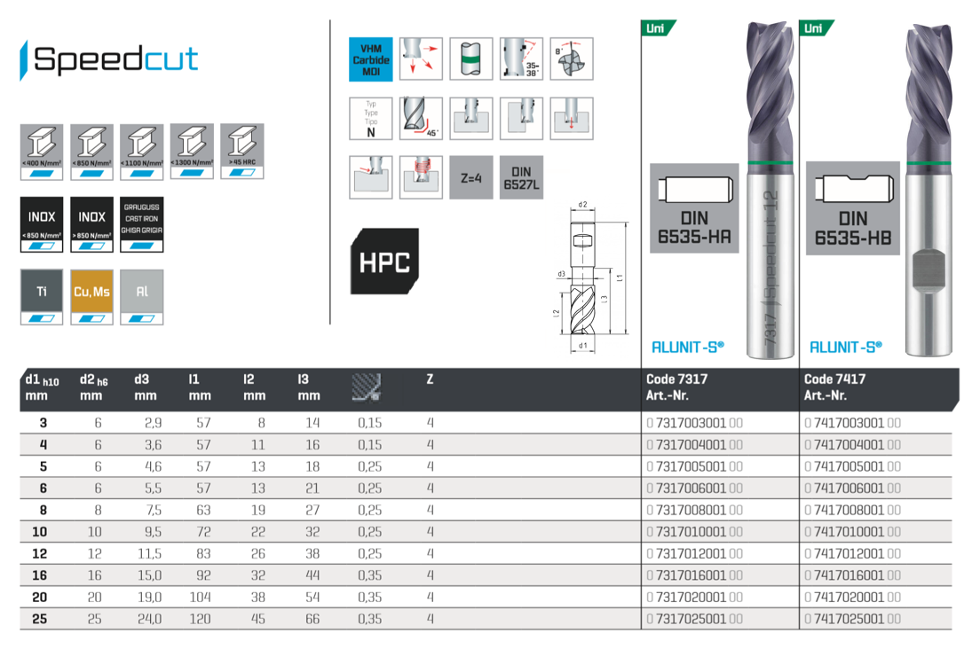 SC-SPEEDCUT Univ., Z=4, Ø 10.0 35-38°, DIN 6527L- relieved, cyl.shank DIN 6535-HA,6535-HB, ALUNIT-S