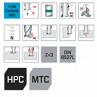 Высокопроизводительная концевая фреза с твердосплавным покрытием для универсального применения, отлично подходит для фрезерования пазов и черновых карманов. Большое пространство для стружки, агрессивный разрез и динамическое пространство для стружки для оптимизированной транспортировки стружки Различные спиральные углы влияют на плавность хода без вибрации. Благодаря меньшему энергопотреблению также подходит для приводных инструментов на токарных станках с ЧПУ (MTC).