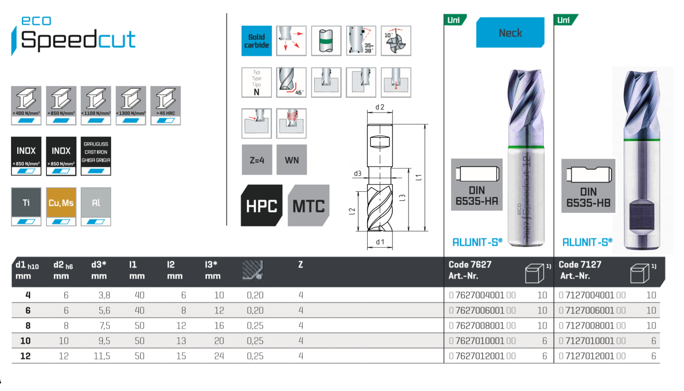 ecoSPEEDCUT Univ., Z=4, Ø 12.0 35-38°, DIN 6527K- relieved, cyl.shank DIN 6535-HA, 6535-HВ ALUNIT-S