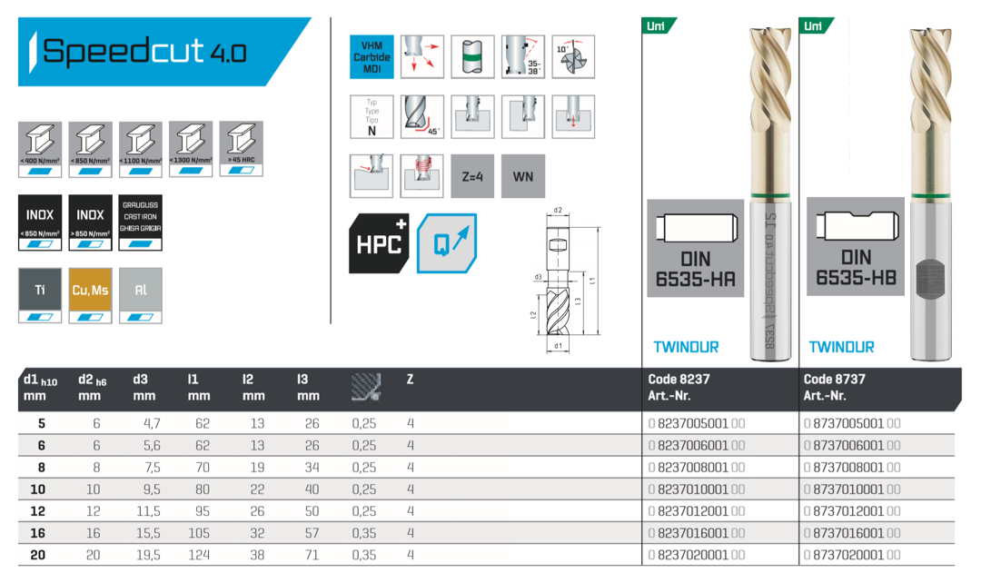 SPEEDCUT 4.0 Universal, Ø 10.0 HPC end mill, Z=4, 35-38°, extra long, with neck, cyl. shank DIN 6535-HA, 6535-HВ, TWINDUR