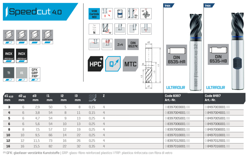 Высокопроизводительная концевая фреза с твердосплавными напайками, особенно подходящая для резки аустенитных нержавеющих сталей: чистовая обработка, черновая обработка и черновая обработка одним и тем же инструментом. Различные углы спирали влияют на плавность хода без вибрации и превосходную поверхность. Поколение 4.0 устанавливает новые стандарты производительности резки.