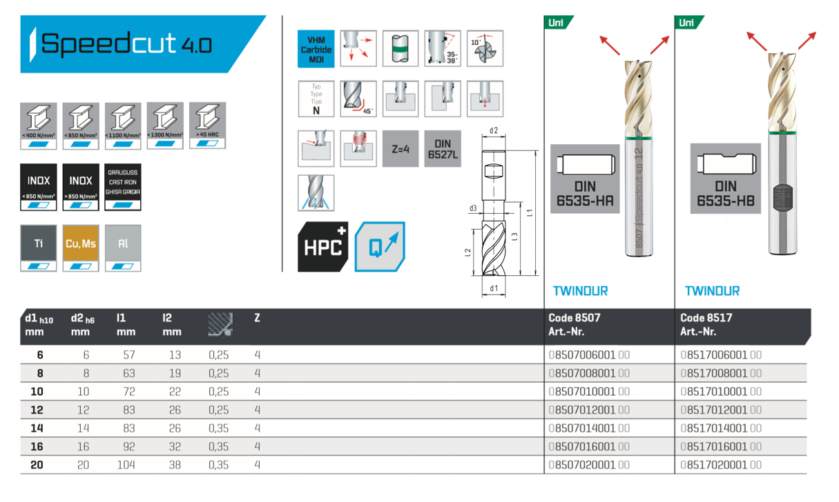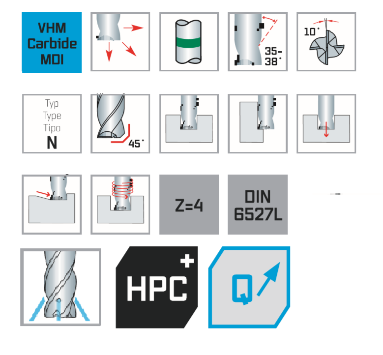 Высокопроизводительная концевая фреза для универсального применения. Чистовая, черновая и черновая обработка одним и тем же инструментом. Различные углы спирали влияют на плавность хода без вибрации и отличную поверхность. Поколение 4.0 устанавливает новые стандарты производительности резки.
