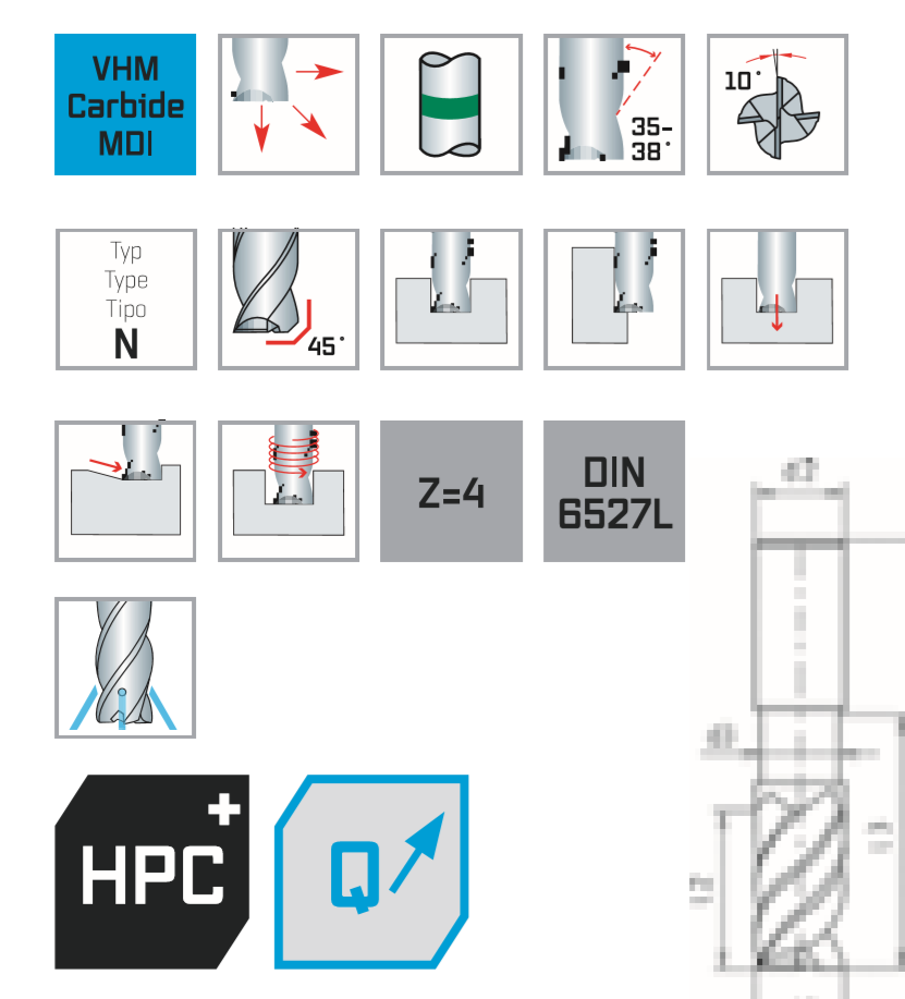 Высокопроизводительная концевая фреза для универсального применения. Чистовая, черновая и черновая обработка одним и тем же инструментом. Различные углы спирали влияют на плавность хода без вибрации и отличную поверхность. Высокая производительность резки.