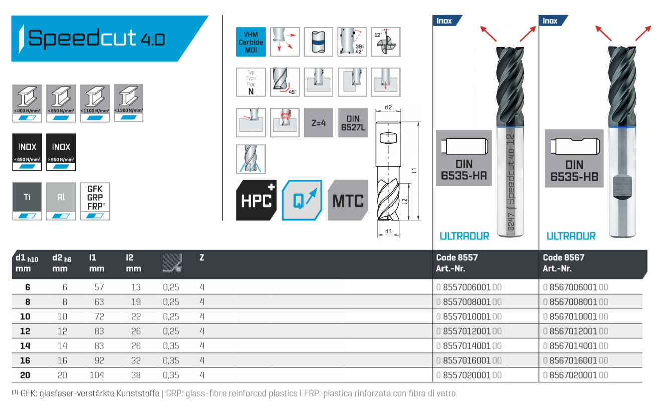 Высокопроизводительная концевая фреза с твердосплавными напайками, особенно подходящая для резки аустенитных нержавеющих сталей: чистовая обработка, черновая обработка и черновая обработка одним и тем же инструментом. Различные углы спирали влияют на плавность хода без вибрации и превосходную поверхность. Поколение 4.0 устанавливает новые стандарты производительности резки.