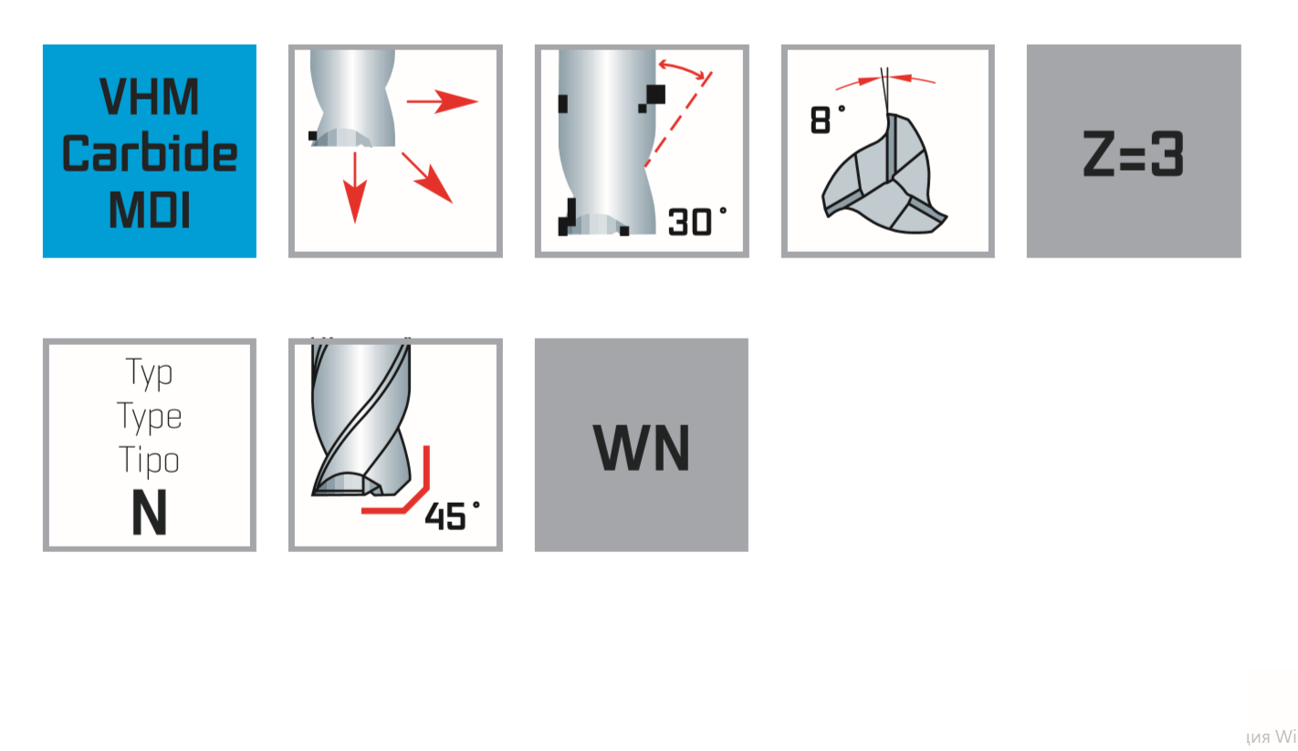 Рекомендуется для фрезерования материалов со средней и высокой прочностью до 1300 Н / мм². Для сверления и последующего продольного и проходного фрезерования.