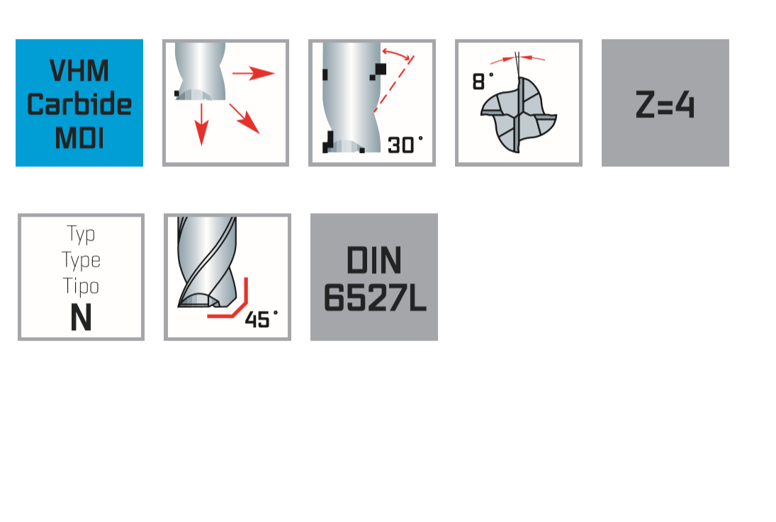 Рекомендуется для фрезерования материалов со средней и высокой прочностью до 45 HRC. Фрезерные канавки с большей глубиной сверления, точные посадки, также подходит для торцевого и кругового фрезерования. Высокие показатели удаления металла и плавный ход обеспечивают превосходное качество поверхности.