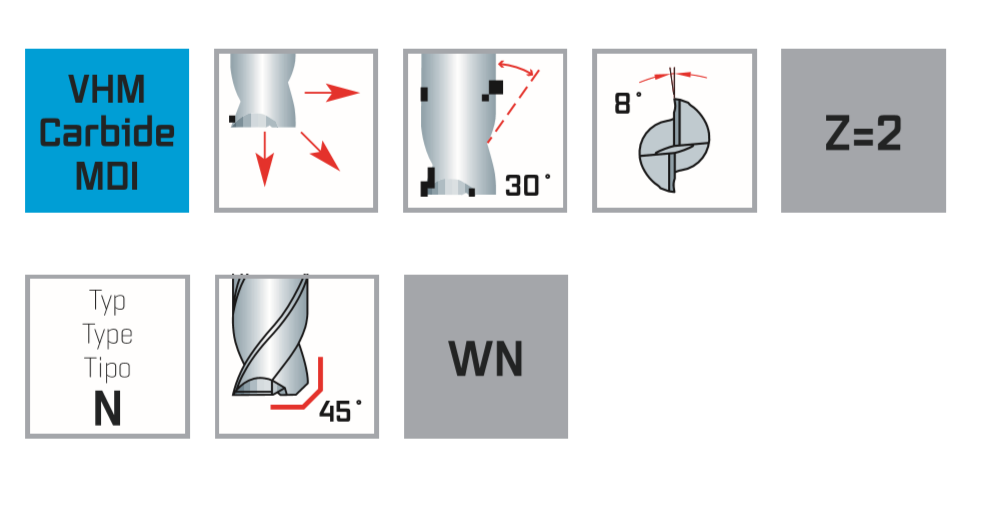 Рекомендуется для фрезерования материалов со средней и высокой прочностью до 1300 Н / мм². Для сверления и последующего продольного и проходного фрезерования.