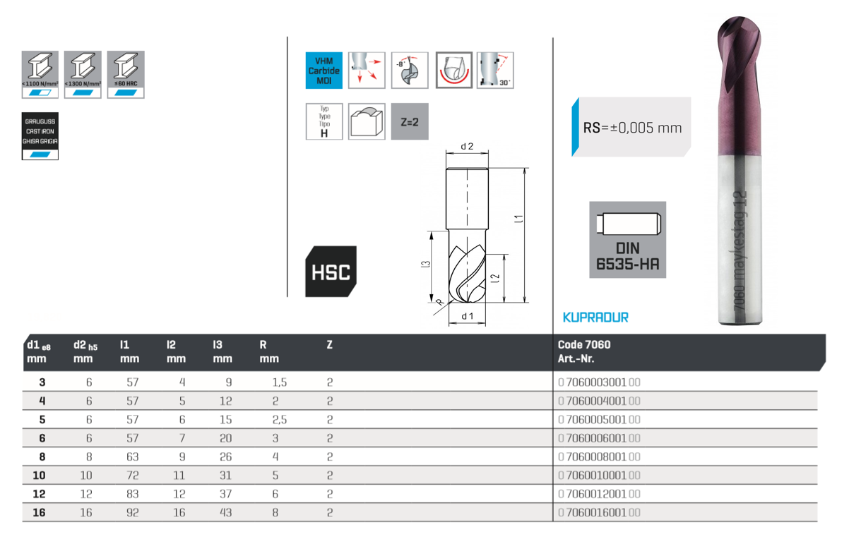 HSC Ballnose end mill Ø 6.0 short, Z=2, 30°, R=3.0 mm, Kupradur coating, cyl. shank DIN 6535-HA