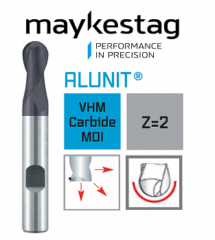 Концевая сферическая твердосплавная фреза MAYKESTAG (VHM) , d 8.0 (Z=2) 30°, L-63 ALUNIT